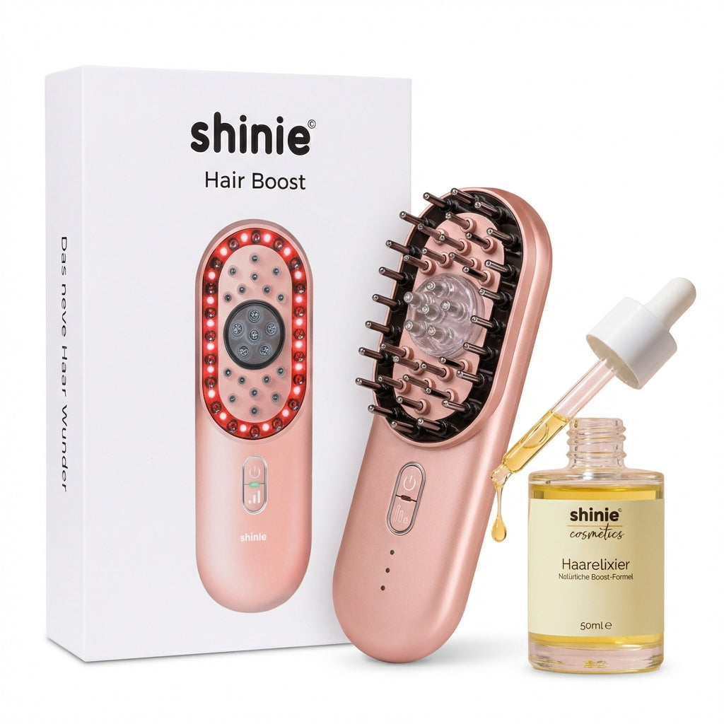 Das shinie HairBoost Bundle – gezielte Kopfhaut-Stimulation für stärkeres, dichteres Haar. Aktiviere dein Haarwachstum, reduziere Haarausfall und bring deine Haare sichtbar zurück in ihre Kraft.